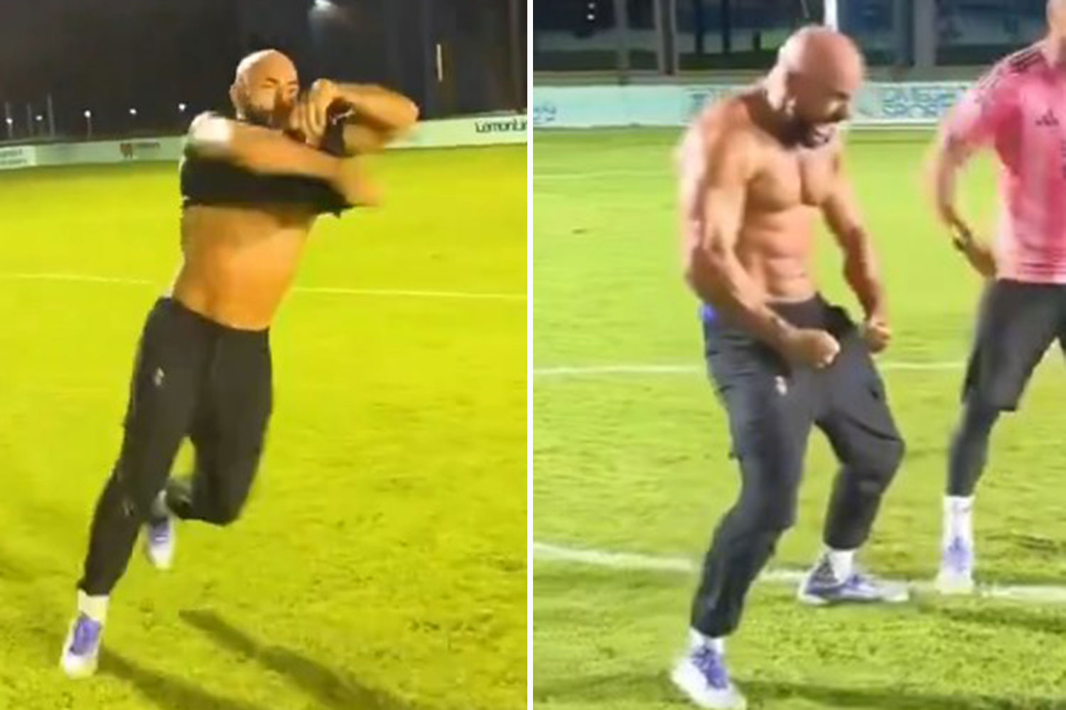 The bodyguard, reportedly raised in Paris, wheeled away in celebration, whipping his shirt off before doing several celebratory MMA-style moves.