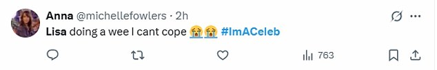 Taking to Twitter fans were left in hysterics as they penned: ‘Lisa doing a wee I cant cope’.