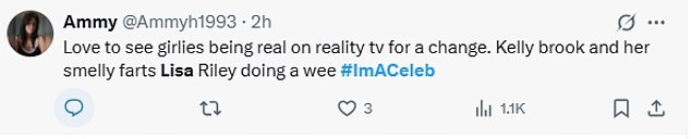 ‘Love to see girlies being real on reality tv for a change. Kelly brook and her smelly farts Lisa Riley doing a wee’;