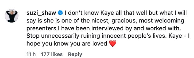 Hear’Say’s Suzanne Shaw said: ‘I don’t know Kaye all that well but what I will say is she is one of the nicest, gracious, most welcoming presenters I have been interviewed by and worked with. Stop unnecessarily ruining innocent people’s lives. Kaye – I hope you know you are loved’.