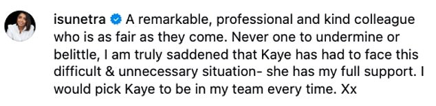 ‘Never one to undermine or belittle, I am truly saddened that Kaye has had to face this difficult & unnecessary situation- she has my full support. I would pick Kaye to be in my team every time. Xx’.