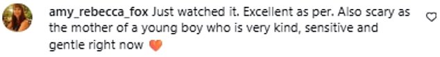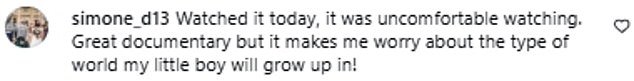 ‘Watched it today, it was uncomfortable watching. Great documentary but it makes me worry about the type of world my little boy will grow up in!’; ‘Just watched it. Excellent as per. Also scary as the mother of a young boy who is very kind, sensitive and gentle right now,’;