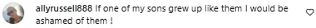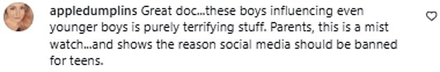 ‘If one of my sons grew up like them I would be ashamed of them !’; ‘Great doc…these boys influencing even younger boys is purely terrifying stuff. Parents, this is a mist watch…and shows the reason social media should be banned for teens.’