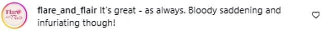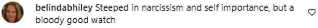 ‘Rewatching for the second time – first watch I was just so utterly furious and gobsmacked I’m not sure whether everything sunk in!!! Another incredible documentary. Bravo,’; ‘Steeped in narcissism and self importance, but a bloody good watch,’; ‘It’s great – as always. Bloody saddening and infuriating though!’; ‘Deeply troubling, brilliantly made,’;