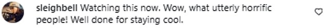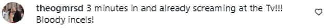 They wrote: ‘Well that was terrifying,’; ‘3 minutes in and already screaming at the Tv!!! Bloody incels!’; ‘Watching right now. I despair!’; ‘Watching this now. Wow, what utterly horrific people! Well done for staying cool,’; ‘Insecurity amplified to terrifying levels. Thank you Louis, for the insights,’;