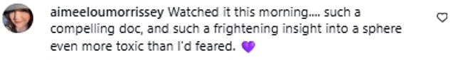 ‘This documentary just showed how horrible and hateful some men really are, absolutely awful awful people. All I can say,’; ‘Watched it this morning…. such a compelling doc, and such a frightening insight into a sphere even more toxic than I’d feared,’;