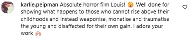 ‘Absolute horror film Louis! Well done for showing what happens to those who cannot rise above their childhoods and instead weaponise, monetise and traumatise the young and disaffected for their own gain. I adore your work,’;