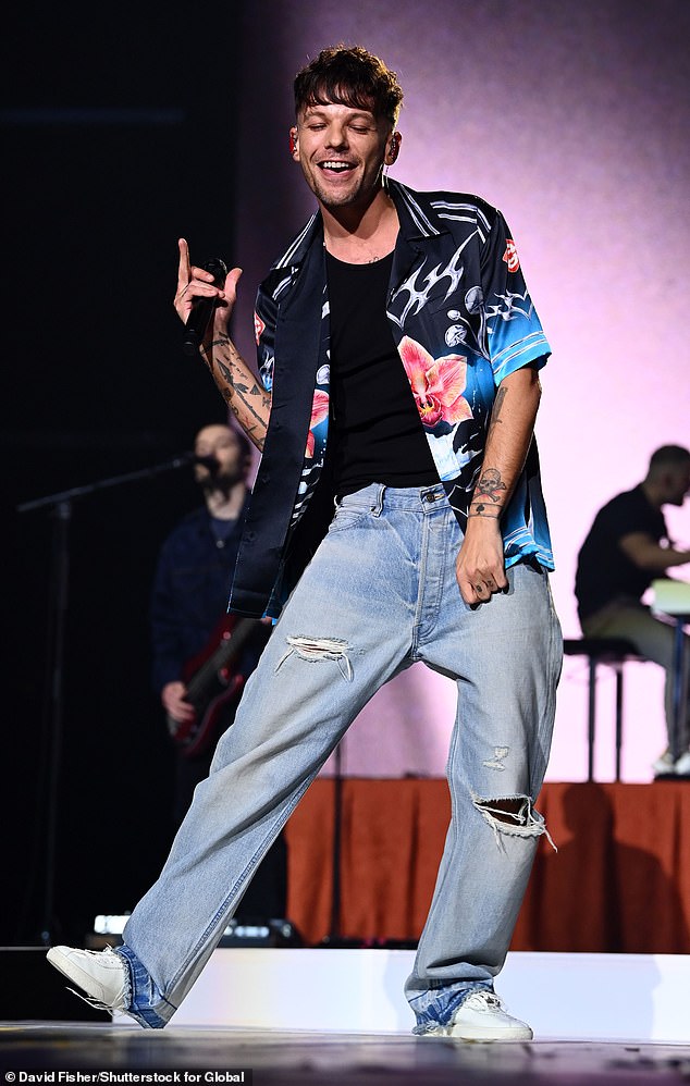 Louis Tomlinson has admitted feeling uncomfortable singing some of One Direction’s ‘f****g raunchy’ lyrics now he is 34 (Pictured last month)