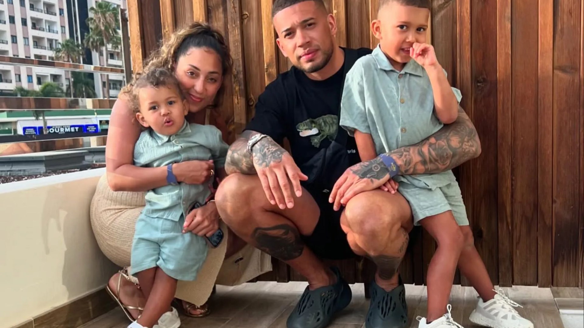 Meanwhile his partner embraced one of the children from behind and wore a beige jumpsuit and naturally wavy hair.