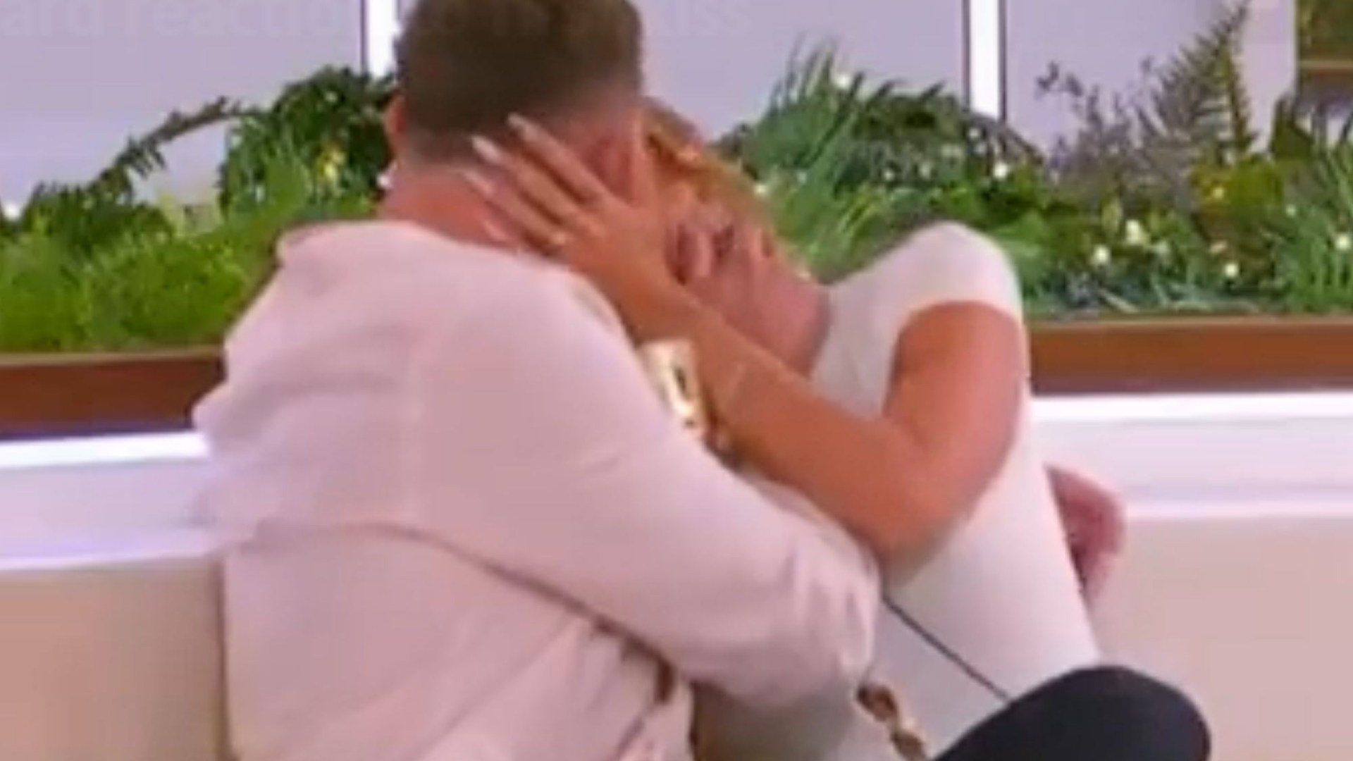 The bashful pair then giggled before Curtis went in for the kiss.