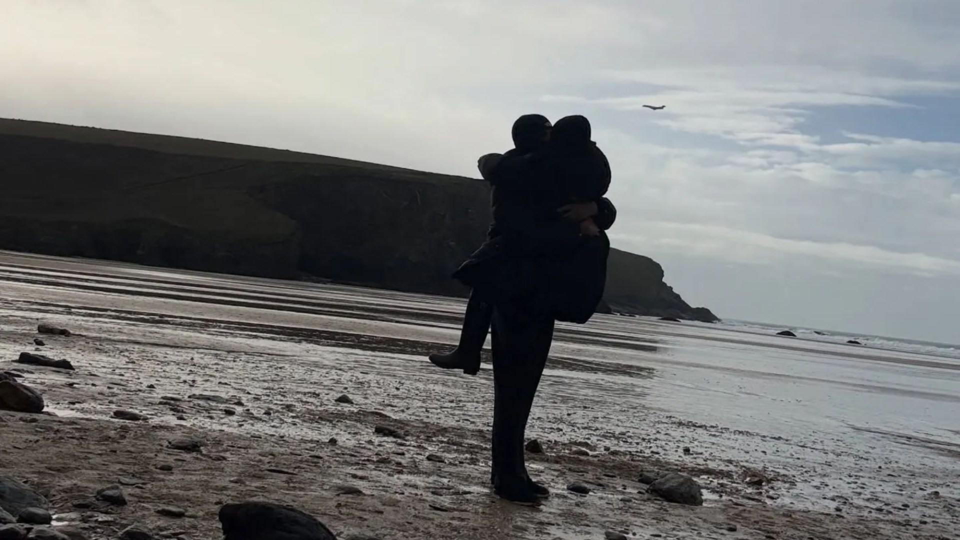 A black and white beach snap showed India in the arms of her new beau as he picked her up for a sweet kiss, his remaining identity hidden.