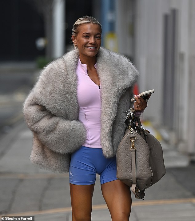 The Love Island star, 31, displayed her toned figure as she slipped into a baby pink top and a pair of blue skintight shorts