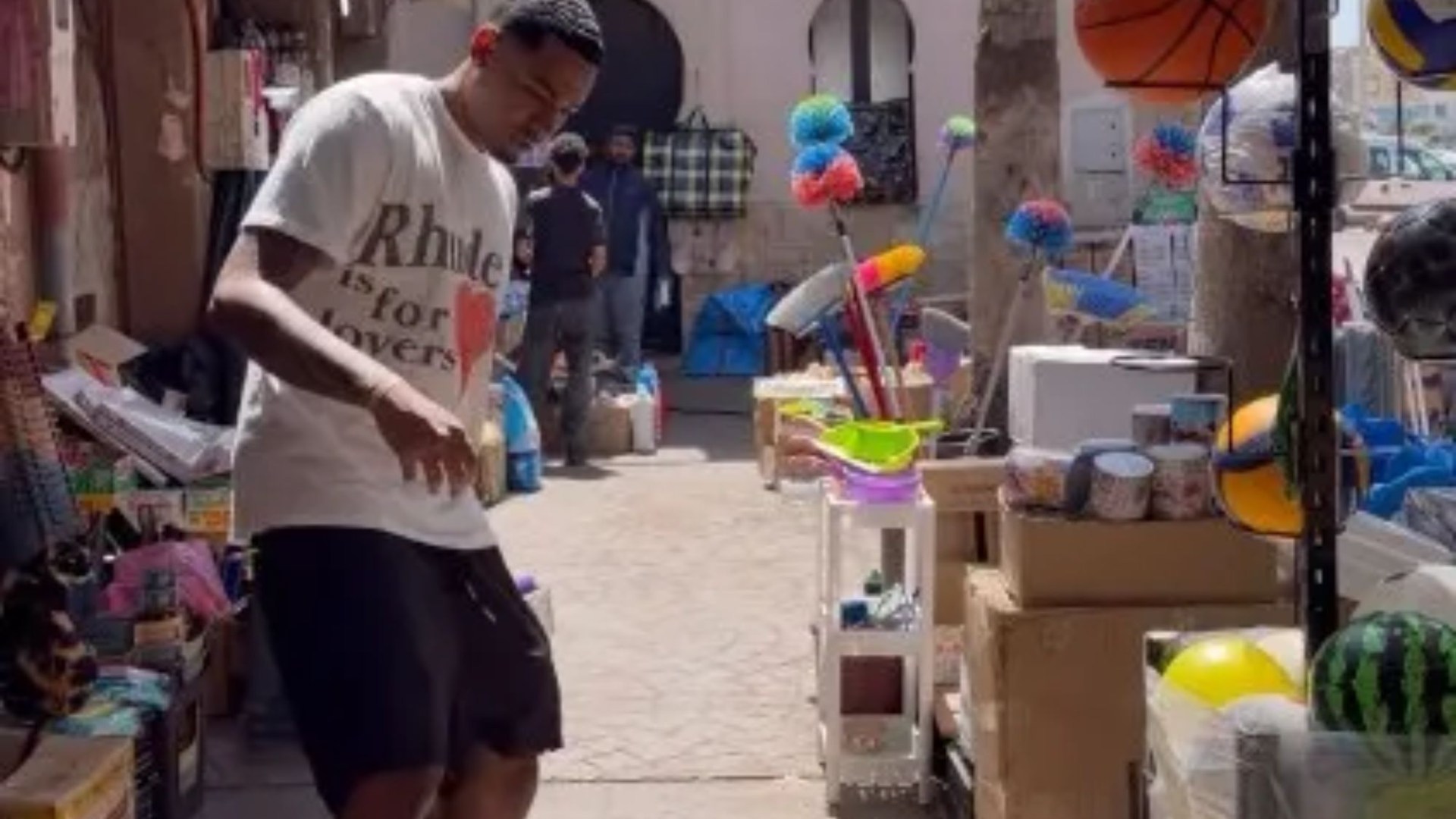 He kicked a ball about in the sunny streets of Agadir, wearing a casual outfit for his day of exploring with Samie.