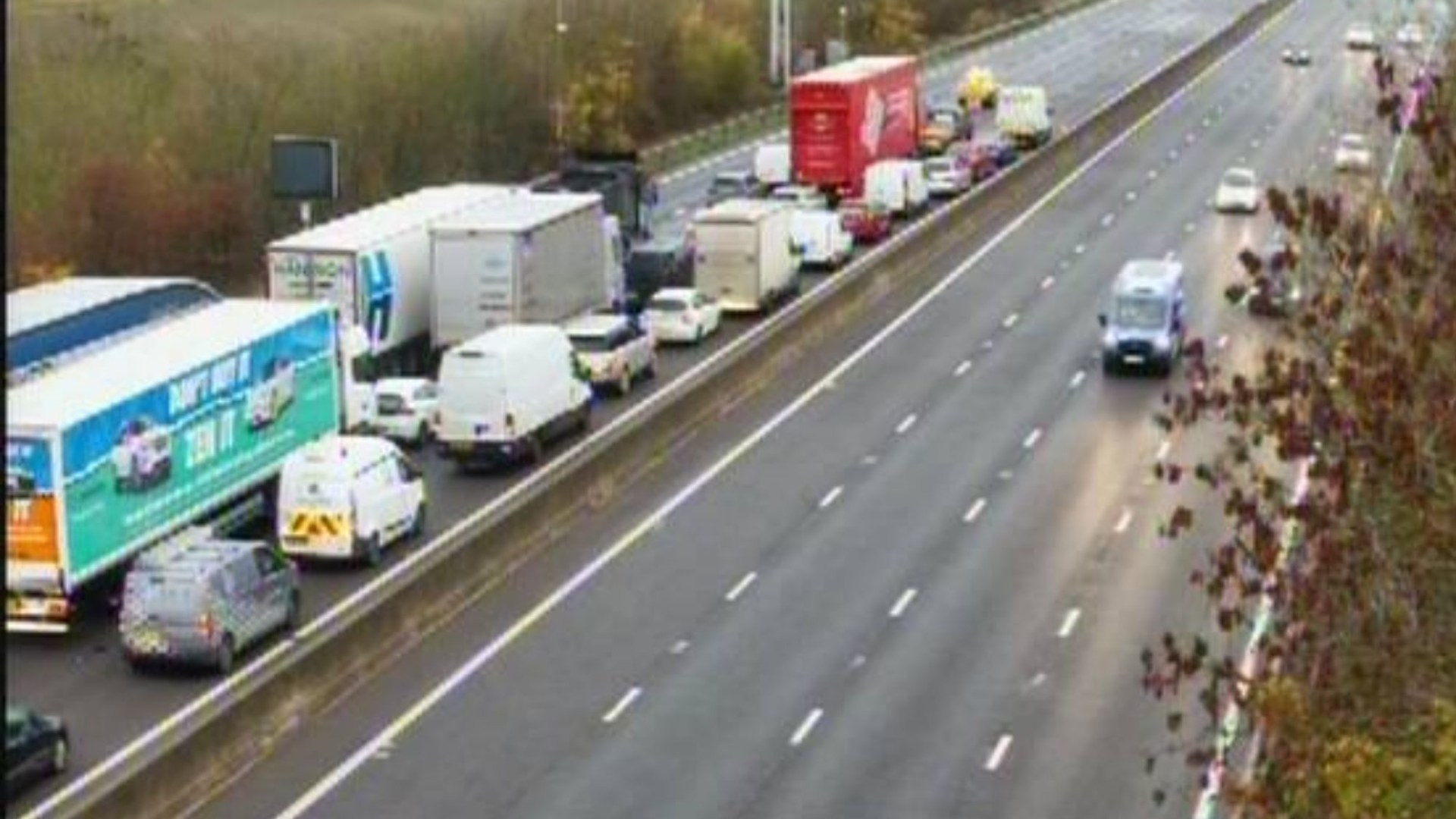 M1 closed in one direction after car hits barrier and comes to rest on its side with drivers warned of delays