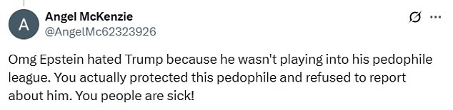 ‘Omg Epstein hated Trump because he wasn’t playing into his pedophile league. You actually protected this pedophile and refused to report about him,’ another added.