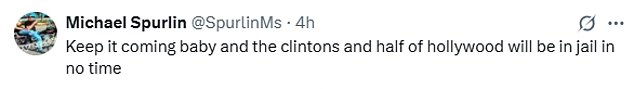‘Keep it coming baby and the Clintons and half of Hollywood will be in jail in no time,’ someone claimed on X.
