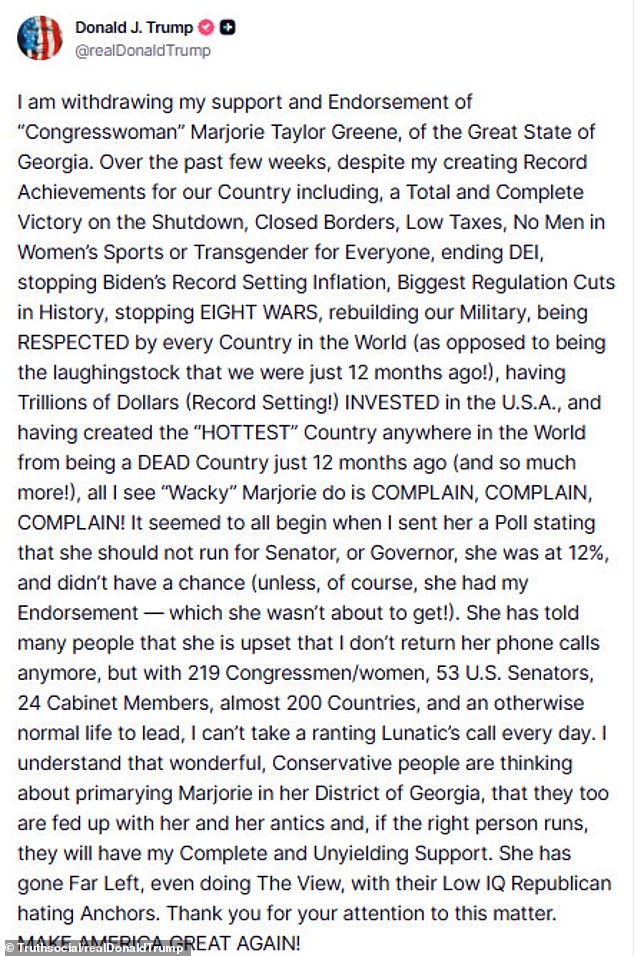 The president – who has long said he cut Epstein off decades ago and did nothing wrong – explosively announced he was ‘unendorsing’ the Georgia Republican, accusing her of becoming ‘left wing’.