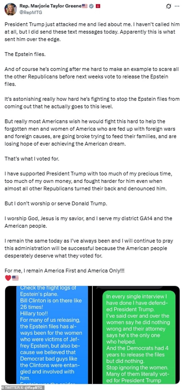 In a lengthy statement on X, Greene explained: ‘[Trump is] coming after me hard to make an example to scare all the other Republicans before next weeks vote to release the Epstein files. It’s astonishing really how hard he’s fighting to stop the Epstein files from coming out that he actually goes to this level.’