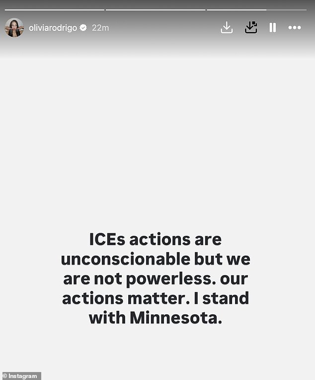 Olivia Rodrigo also took to Instagram on Saturday and wrote, ‘ICEs actions are unconscionable but we are not powerless. our actions matter. I stand with Minnesota.’