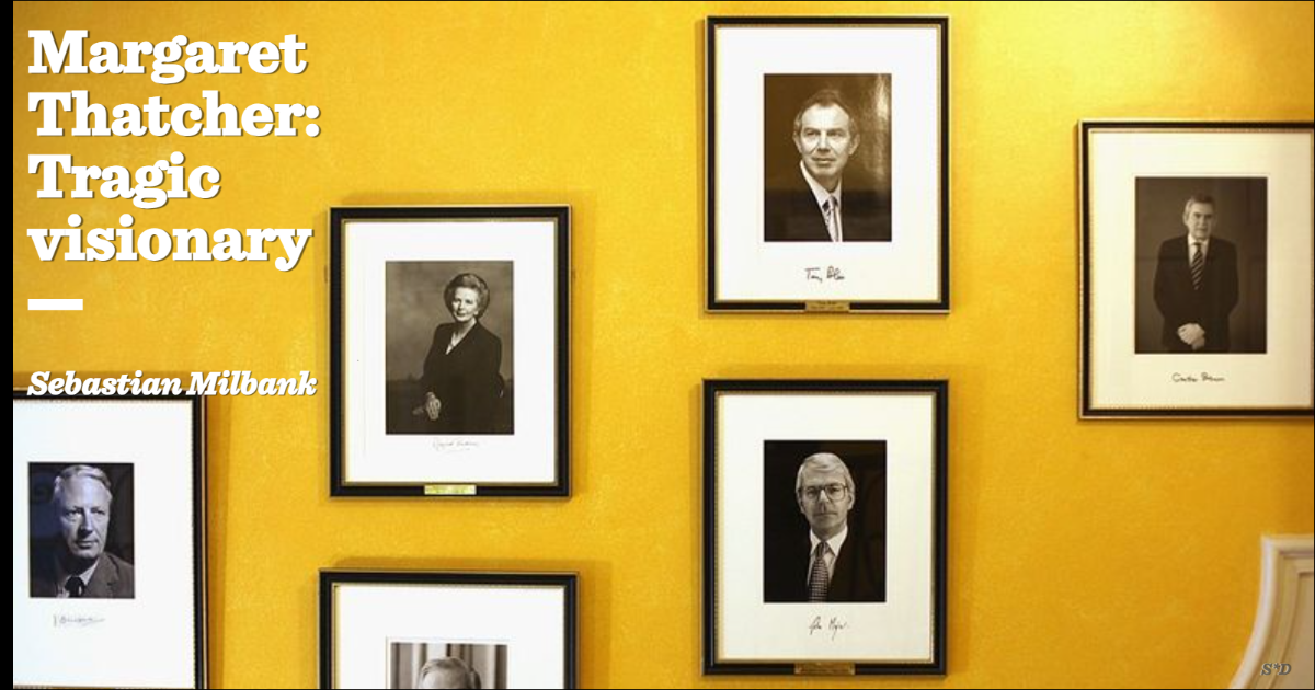 Looking back on Thatcher today, it is impossible not to regard her as a tragic figure in the most classic sense of the term. Tragic heroes are tragic not because they are bad, but because they are great and virtuous men and women whose merits are undermined by a fatal flaw. Thatcher is without doubt the greatest British post war leader; one whose brilliant rhetoric was matched by a strength of character entirely unique in an age of weak, managerial politicians. Her driving instinct that the British establishment was rotten, that the unions were a retrograde force, and that the British economy had become sclerotic were all entirely correct. Yet this historic, visionary politician had hitched her star to the economic orthodoxies of Friendman and Hayek, and navigated the ship of state by the treacherous beacon of Mont Pelerin.