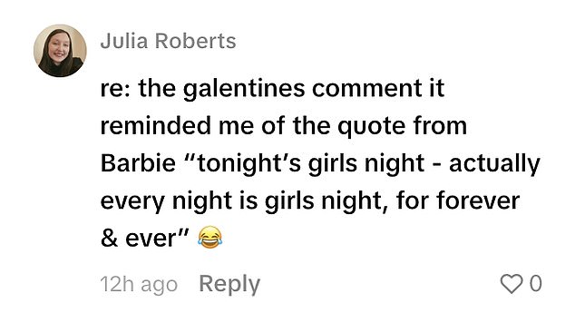 The clip, shared on TikTok by Hollywood Reporter, fans commented: ‘The galentines comment it reminded me of the quote from Barbie “tonight’s girls night”‘;