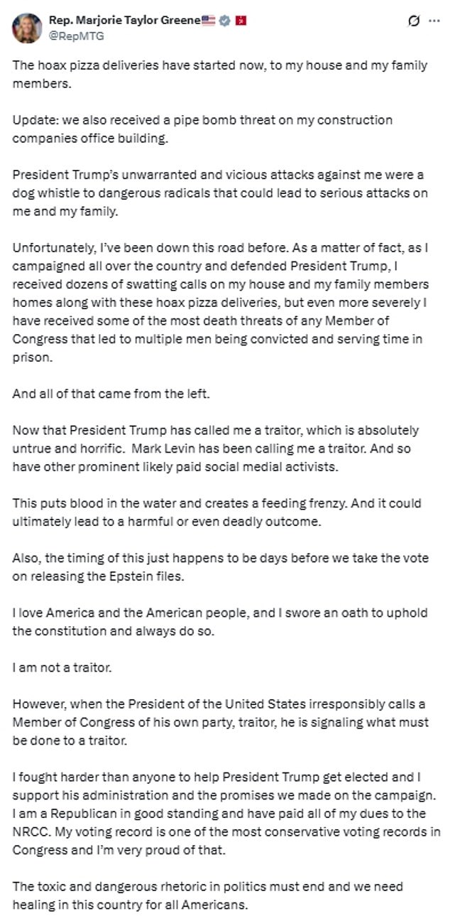 Greene also noted: ‘The timing of this just happens to be days before we take the vote on releasing the Epstein files.’