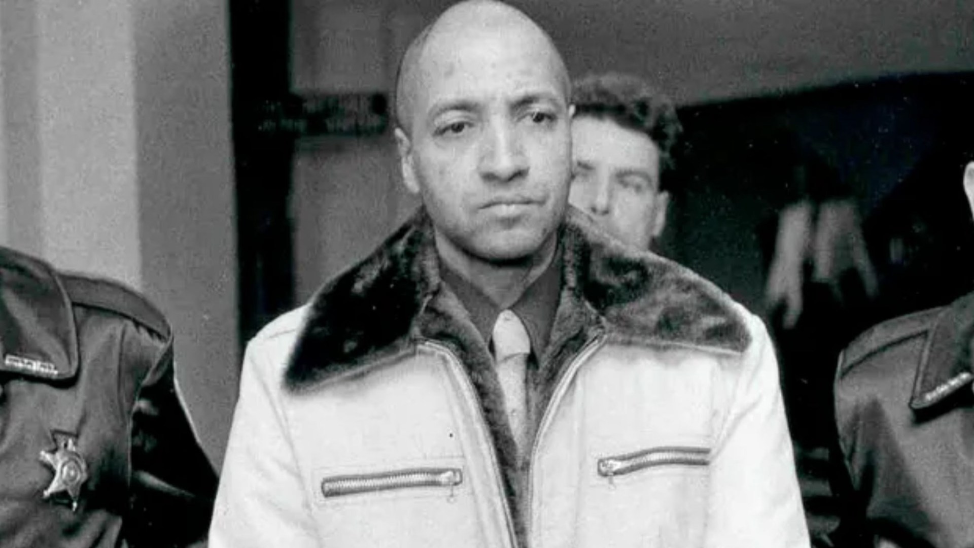 An image collage containing 3 images, Image 1 shows Convicted killer George Banks led through a courthouse while handcuffed between two officers, Image 2 shows Collage of three black and white portraits of children. From left to right: Montanzima Banks, Kissmayu Banks, and Nancy Lyons, Image 3 shows Police officers stake out a house during the George Banks mass shooting in Wilkes-Barre, Pennsylvania