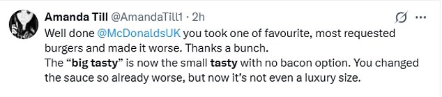 A third posted: ‘@McDonaldsUK you have p****d half the nation off today, can you please tell me why you think it’s acceptable to change the big tasty???’