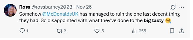 Another wrote: ‘Somehow @McDonaldsUK has managed to ruin the one last decent thing they had. So disappointed with what they’ve done to the big tasty.’