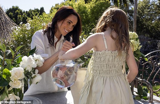 Meghan also shared two pictures of herself with her daughter as she helps pour water in the vase and another of her hiding under the table