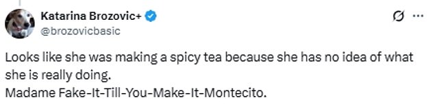 A third said: ‘Looks like she was making a spicy tea because she has no idea of what she is really doing. Madame Fake-It-Till-You-Make-It-Montecito.’