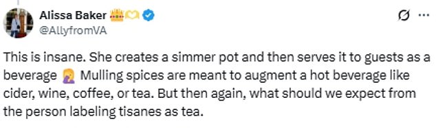 Another remarked: ‘She creates a simmer pot and then serves it to guests as a beverage.