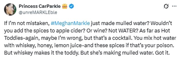 In a post shared to X, one commenter wrote: ‘If I’m not mistaken, Meghan Markle just made mulled water? Wouldn’t you add the spices to apple cider? Or wine? Not WATER?’