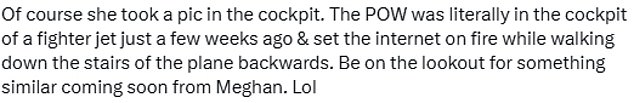 ‘Of course she took a pic in the cockpit. The POW was literally in the cockpit of a fighter jet just a few weeks ago and set the internet on fire while walking down the stairs of the plane backwards.’