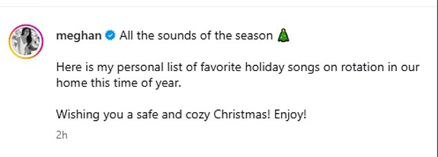 Meghan captioned the post: ‘All the sounds of the season. Here is my personal list of favorite holiday songs on rotation in our home this time of year.