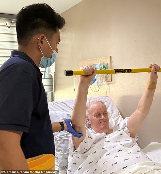 ‘He was able to get out of bed and was taken by a wheelchair to a recreation room where he enjoyed food and entertainment with some of the other rehab patients. He’s in good spirits, grateful to be alive and working really hard to get better. He a brave man and is determined to walk again with the aid of a prosthetic leg.’
