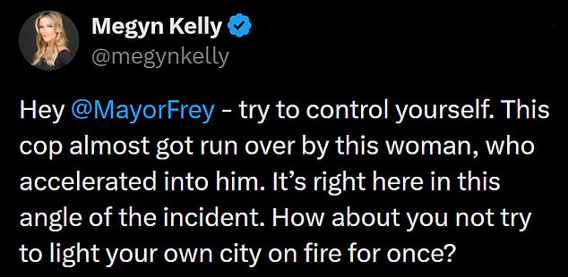 ‘Hey @MayorFrey – try to control yourself,’ Kelly wrote on X. ‘This cop almost got run over by this woman, who accelerated into him.’