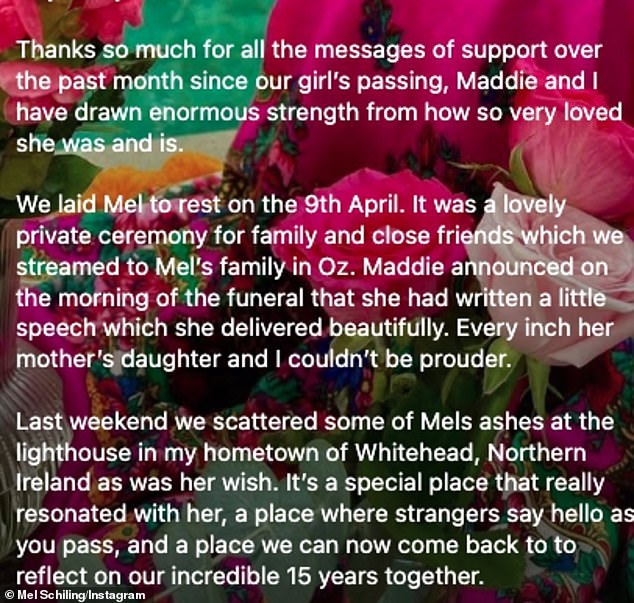 ‘We laid Mel to rest on the 9th April. It was a lovely private ceremony for family and close friends which we streamed to Mel’s family in Oz. Maddie announced on the morning of the funeral that she had written a little speech which she delivered beautifully. Every inch her mother’s daughter and I couldn’t be prouder’.