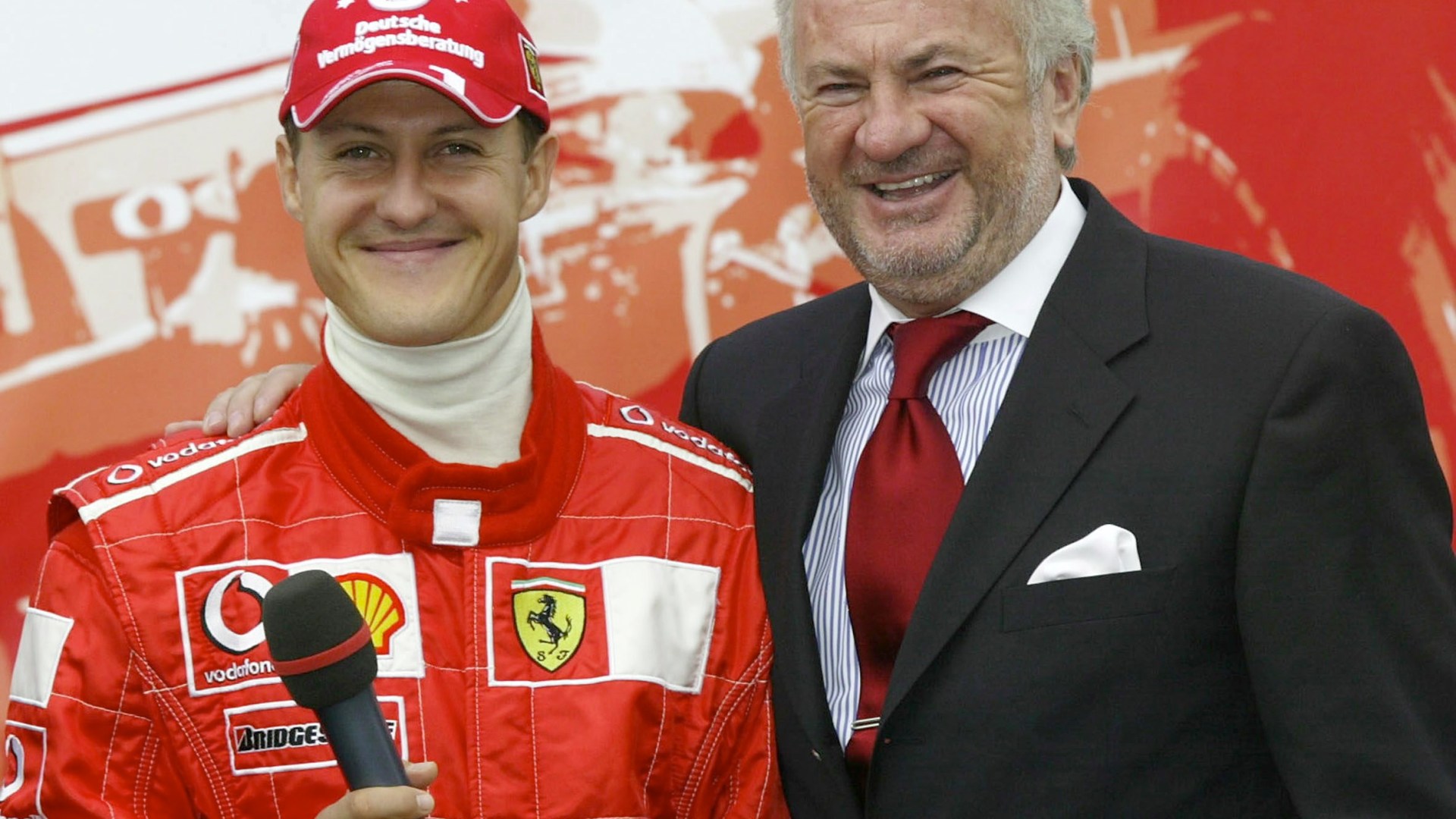Michael Schumacher in a red racing suit and red cap holding a microphone, with Willi Weber in a suit and red tie.