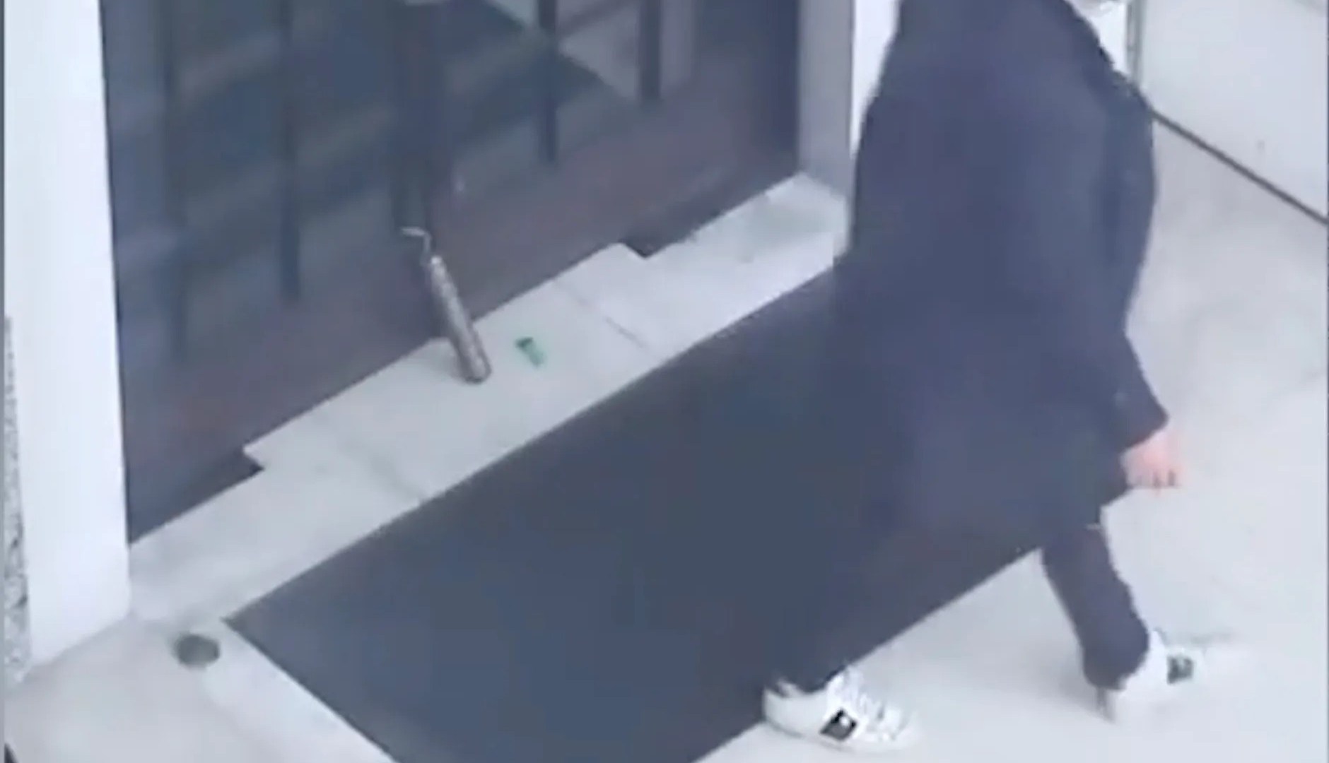 Walking up to the double doors of the security services headquarters again he places the suspicious item against the bottom of the frame.