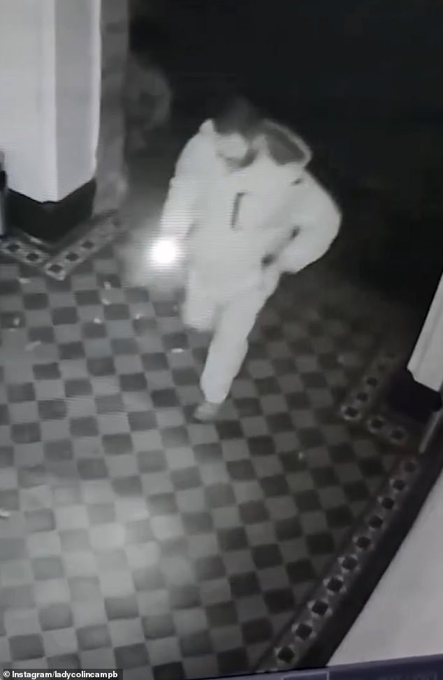 The socialite, pictured in a social media video showing CCTV footage of the incident, is offering a reward for help catching the burglar