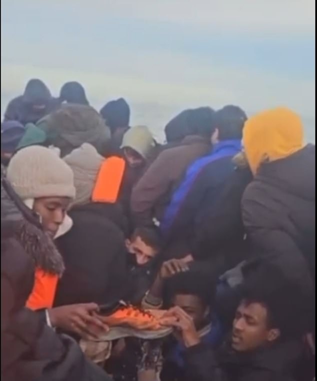 One source said: ‘The boat is dangerously close to sinking. The migrants are using the trainers to get the water out of the boat which is coming through.