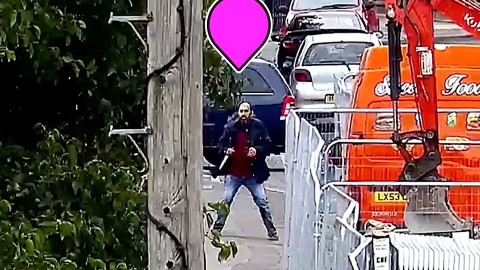 Two people were injured and children were forced to flee as the knifeman is seen brandishing the weapons.