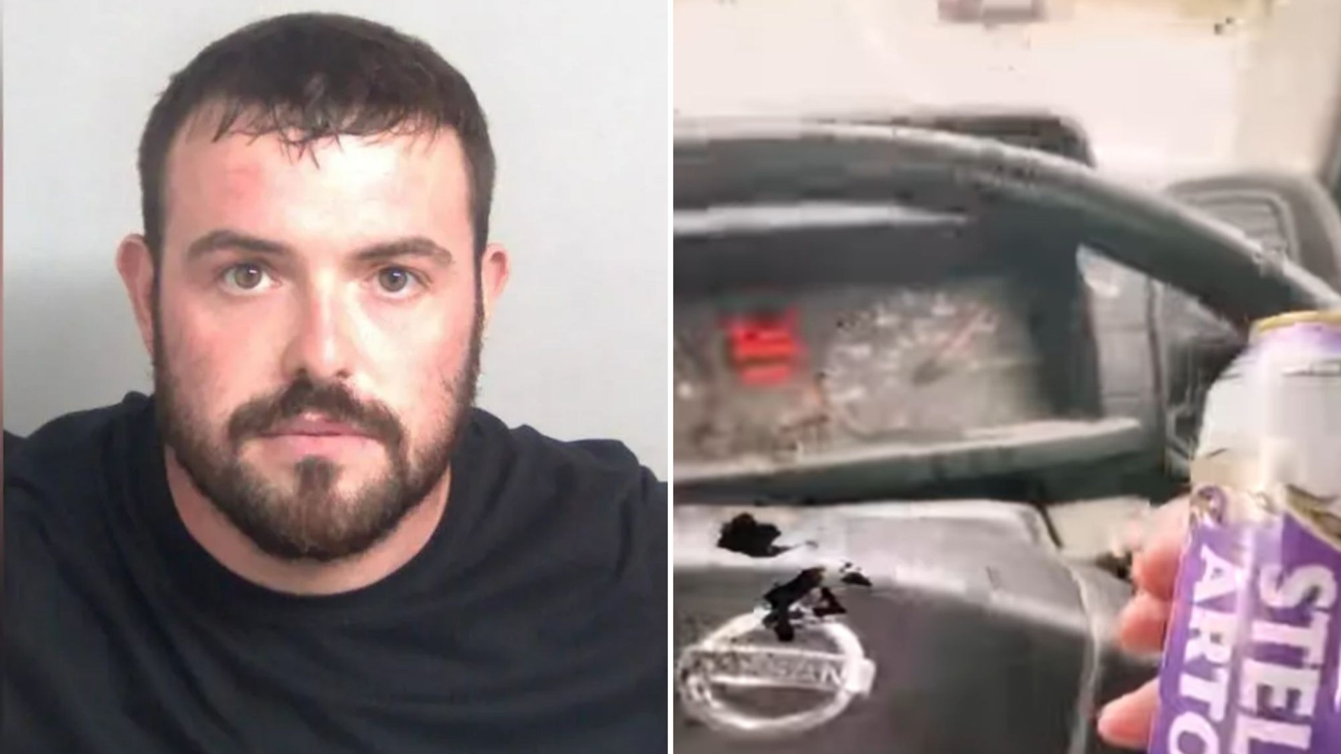 THIS is the moment a reckless driver films himself downing a can of Stella at the wheel before a horror crash injuring two people.