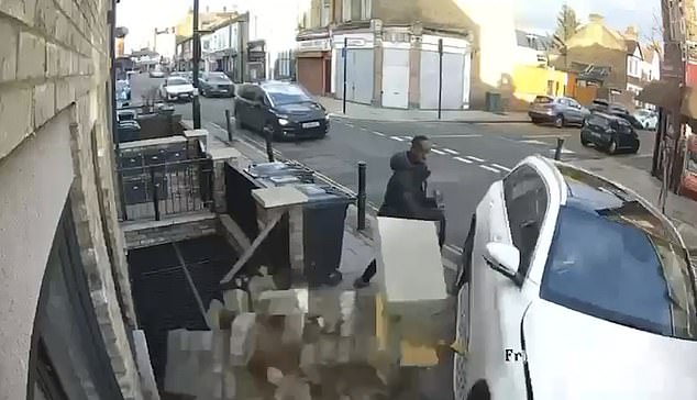 The car then crashes into the front wall of a row of houses in Boston Road causing the wall and fence to immediately collapse, the CCTV footage obtained by The Daily Mail shows.