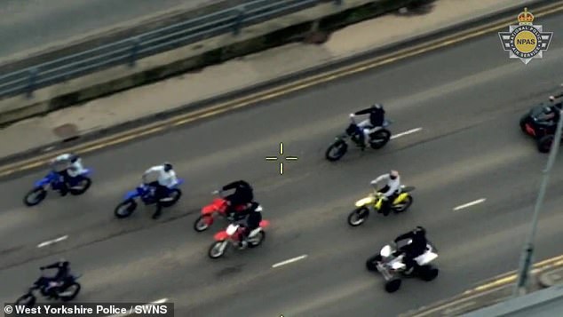 Footage taken from an aerial position shows the group of yobs ignoring red lights, weaving between cars and speeding through junctions on Saturday, February 1, in Leeds.