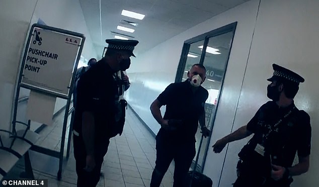 Holub is led through Luton Airport as an officer quips: ‘At least you get to beat the queues’
