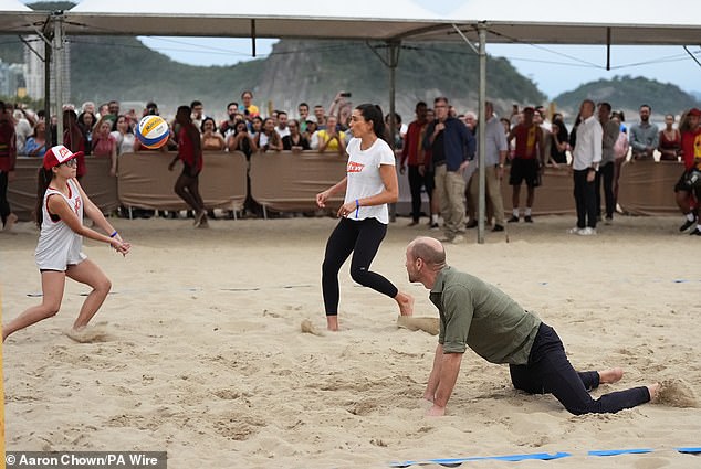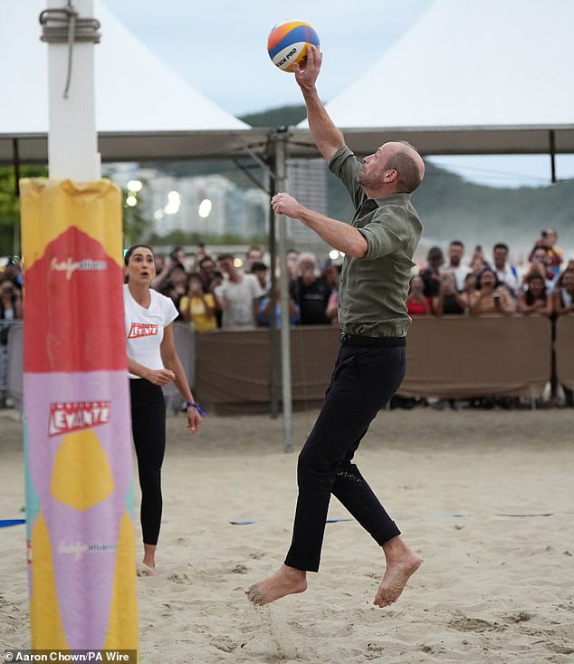 But this was not the royal’s only sporty engagement of the day as he was later seen barefoot while throwing himself around on the sands of Copacabana beach alongside Olympic star Carolina Solberg.