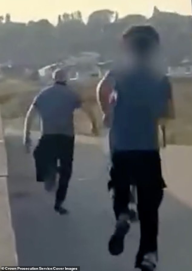 The 16-year-old boy, wearing a grey t-shirt, is seen smacking Mr Cashford over the back of the head with a glass bottle, prompting him to flee down the beachfront promenade.