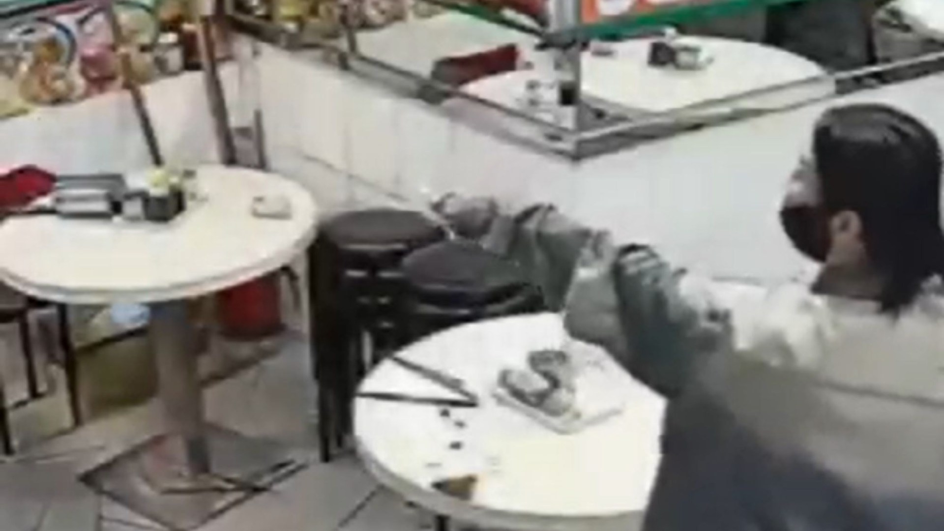 Surveillance footage from inside the restaurant shows the suspect charging toward officers, frantically waving a meat cleaver in the air.